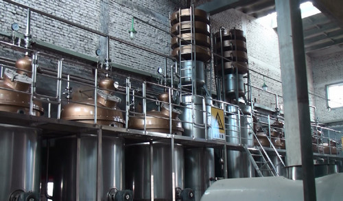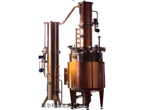 該蒸餾器是化工生產(chǎn)中分餾工藝的典型設(shè)備。在酒精生產(chǎn)中也已被廣泛使用。這種蒸餾設(shè)備可以蒸得純度很高的精餾酒精。但食用酒精的生產(chǎn)要求有所不同,為了形成特有的芳香和口味,在原酒蒸餾時,不要求蒸得極高的純度,但必須把一些有芳香的物質(zhì)如高級醇類、脂類、芳香醛類等提取出來。而塔式蒸餾器只適于提取酒精,而不利于提取醪液中的芳香物質(zhì)。因此用塔式蒸餾器蒸餾的原酒,酒質(zhì)和口感較差(如合理降低出酒塔節(jié),會有所改善)。不適合用于蒸餾高檔酒。該設(shè)備可進行連續(xù)蒸餾,朗姆酒生產(chǎn)多有采用。