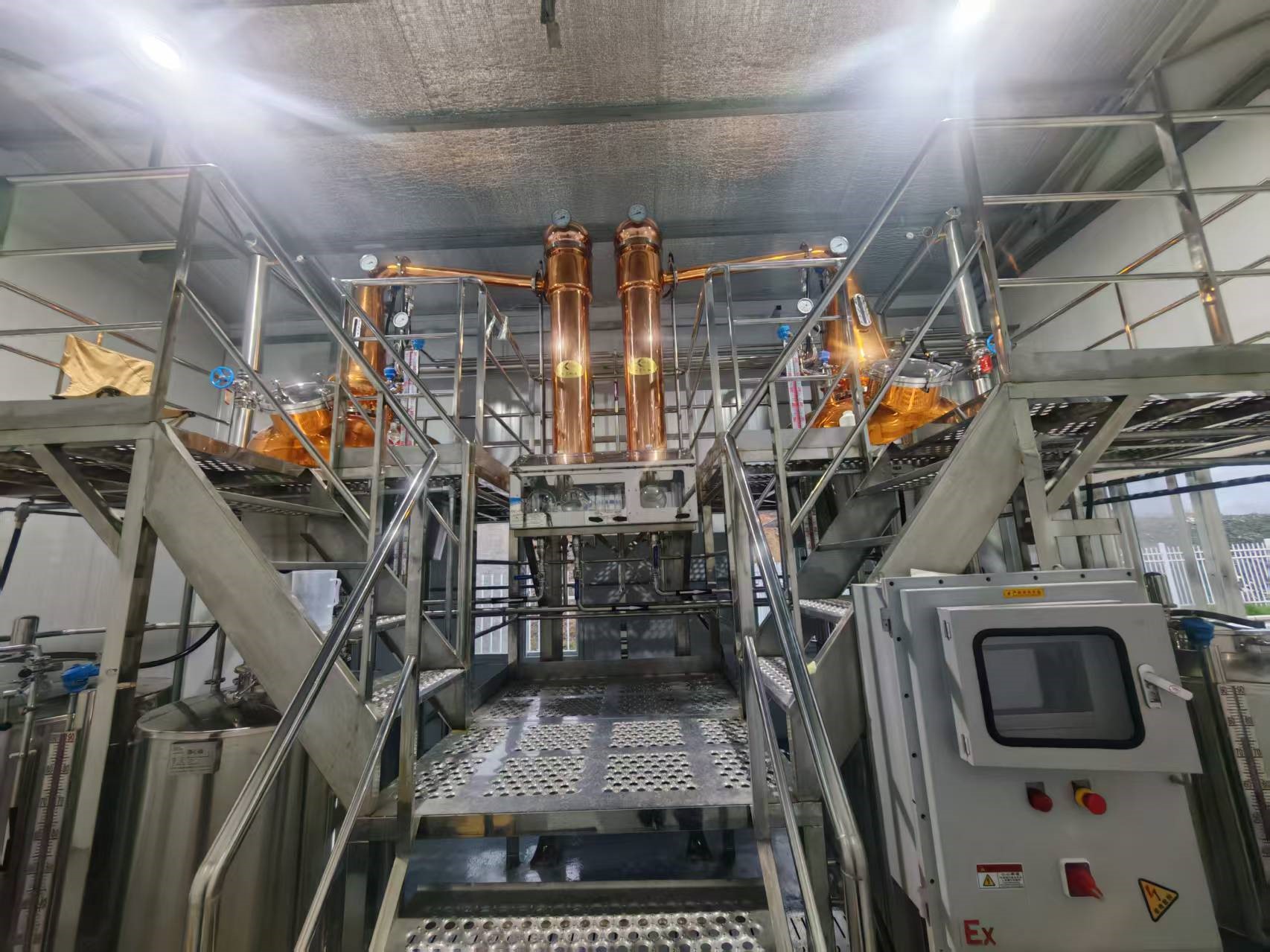 蒸餾器、分餾器選用高純度紫銅板制作,其不僅具有良好的導熱性,銅離子還是原酒中某些酯化反應的催化劑,能使原醪中各種有利組分加速轉(zhuǎn)化生成,能去除不需要的含硫化合物,可以使丁酸、已酸、癸酸、月桂酸等形成不溶性銅鹽而析出,使這些不良氣味的酸被去除。